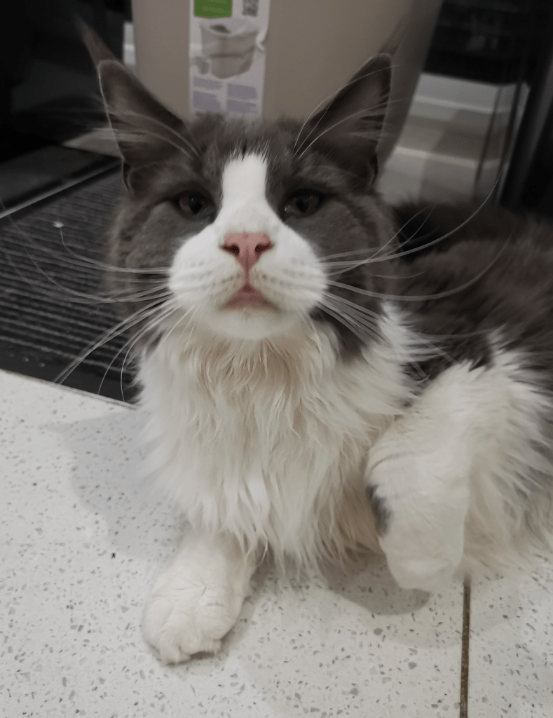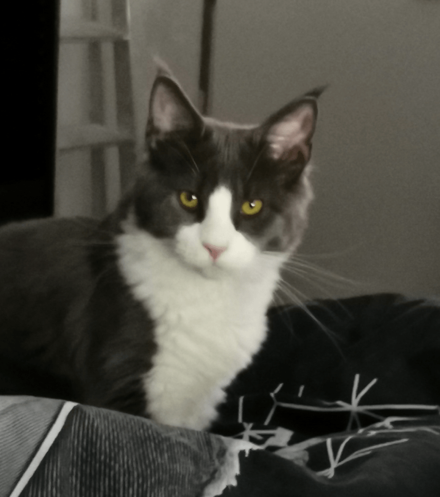 « Mon maine coon Vador est un amour de chat. Et ça ronronne et ça demande des câlins et ça vous suit aux toilettes ou dans la salle de bain.